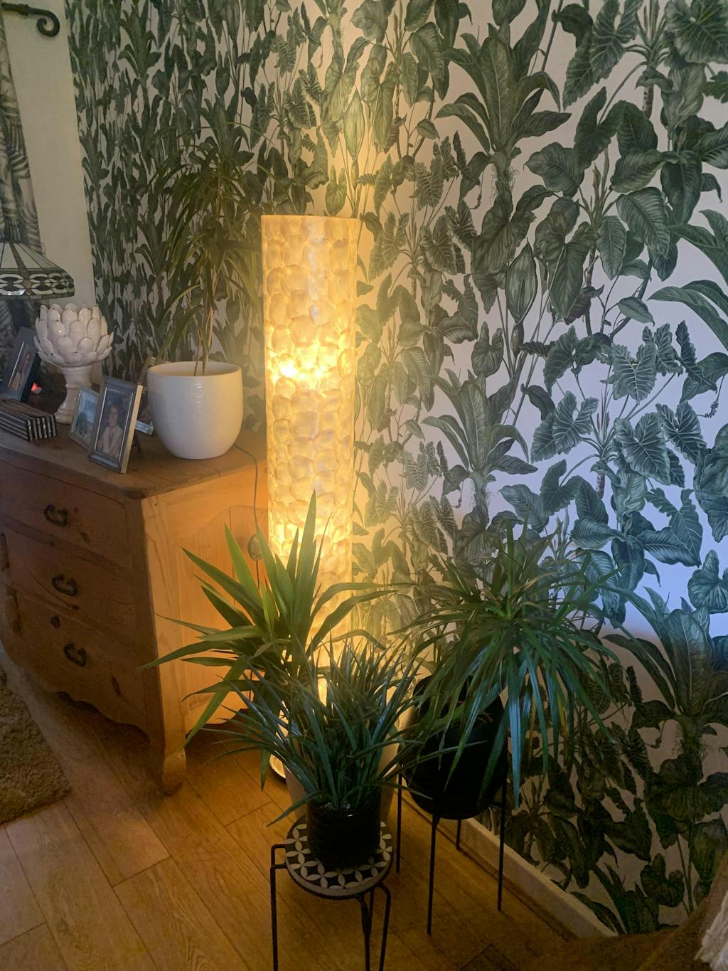 Natural floor lamp, covered in sustainably sourced white mother of pearl, which glistens in the daylight and creates a glow akin to moonlight in the evening. Comes in 3 complimentary heights, allowing you to add variety to your decorative lighting displays.